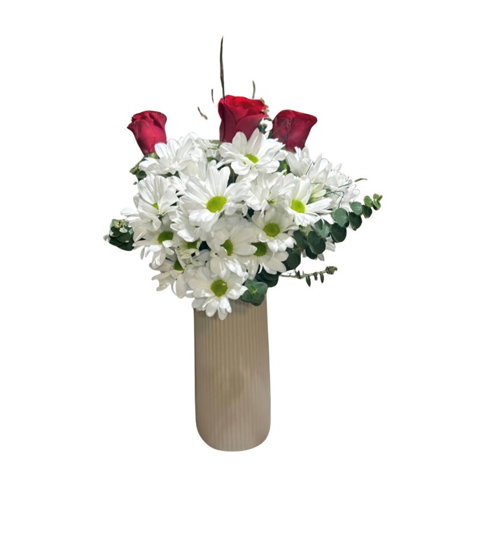 Siyah Çizgili Vazoda Gül ve Papatyalar