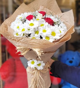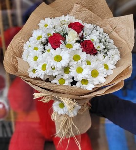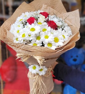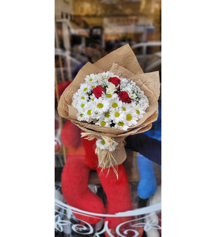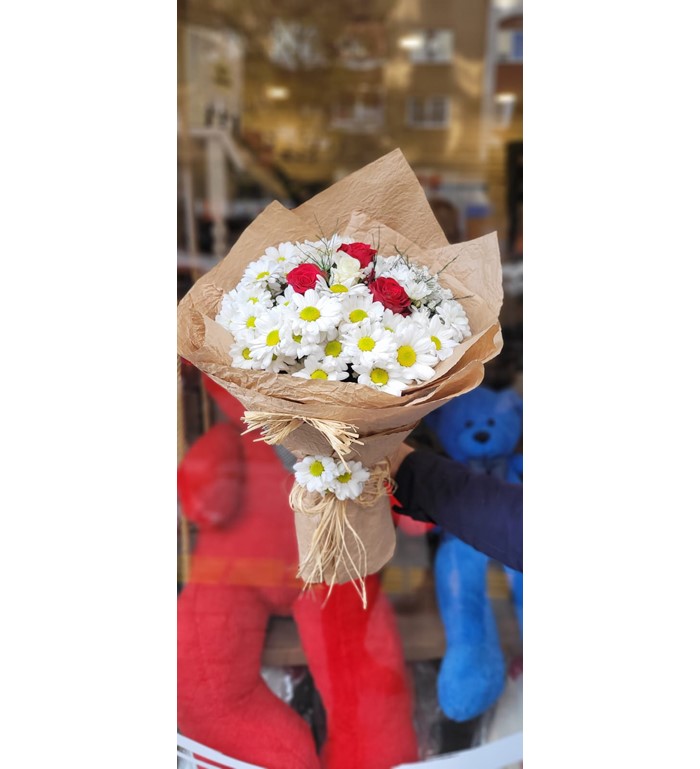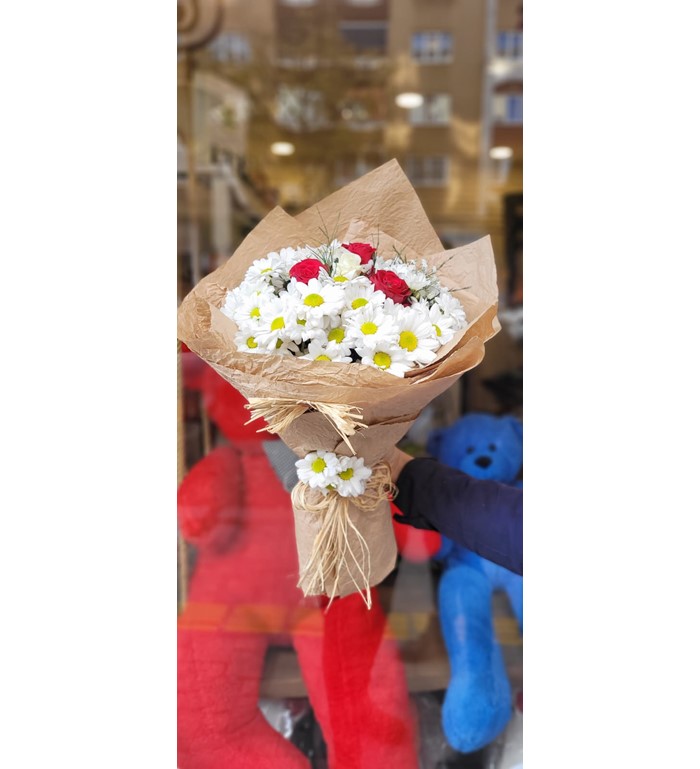 DOĞAL SÜSLEMELİ PAPATYA İÇERİSİNDE 3 KIRMIZI GÜL 1 BEYAZ GÜL BUKETİ