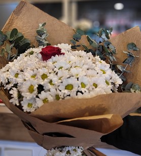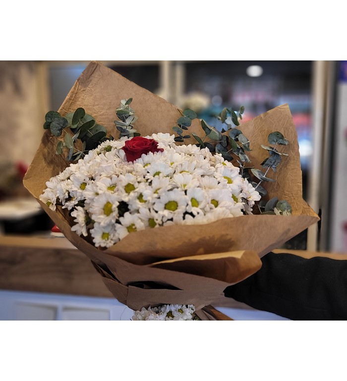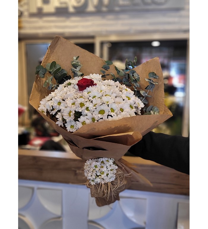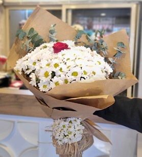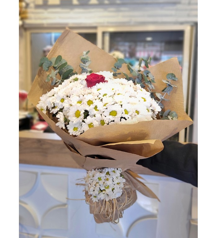 DOĞAL SÜSLEMELİ PAPATYA İÇERİSİNDE 3 KIRMIZI GÜL 1 BEYAZ GÜL BUKETİ